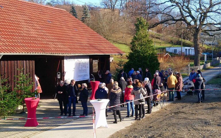 Bereits für die Grundsteinlegung wird die Scheune auf dem Gelände des Bauvorhabens „erlebnisreich wohnen“ Treffpunkt für die Gemeinschaft.