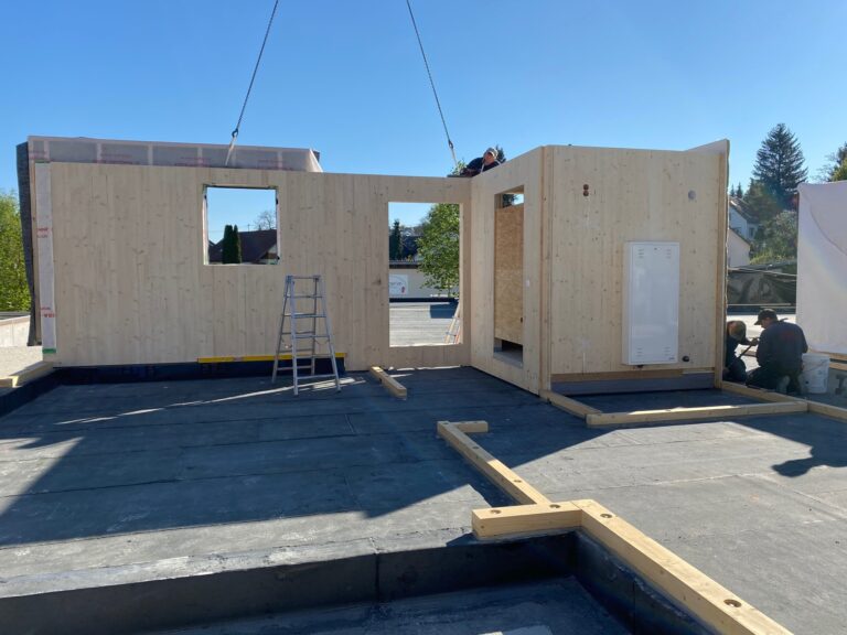 Bei unserem Bauvorhaben Baugruppe Balingen „erlebnisreich wohnen“ haben die Holzbauarbeiten begonnen. Die ersten vorgefertigten Elemente der Wände des 1. Bauabschnittes stehen und die Modulbäder sind gesetzt.