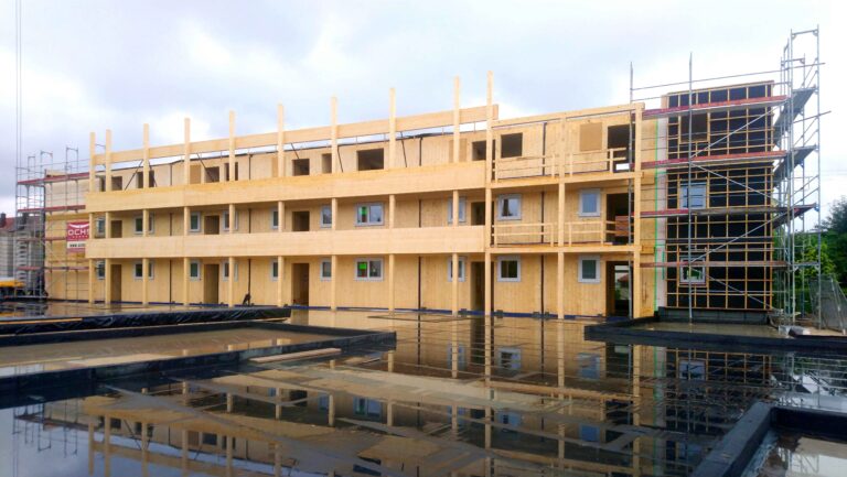 Unser Projekt ‚Mitarbeiter:innenwohnheim Wieblinger Weg‘ nimmt Form an: Dank Vorfertigung sowohl in hohem Tempo als auch in Punkto Ökologie. Hierfür kommen vorgefertigte Hohlwandelemente zum Einsatz, welche mit ‚RC-Beton‘ (Recycling Beton) aufgefüllt werden. Die Außenwände (Fassade) und Geschossdecken werden aus Massivholzplatten vorgefertigt und treffen demnächst auf der Baustelle ein. Mit diesem