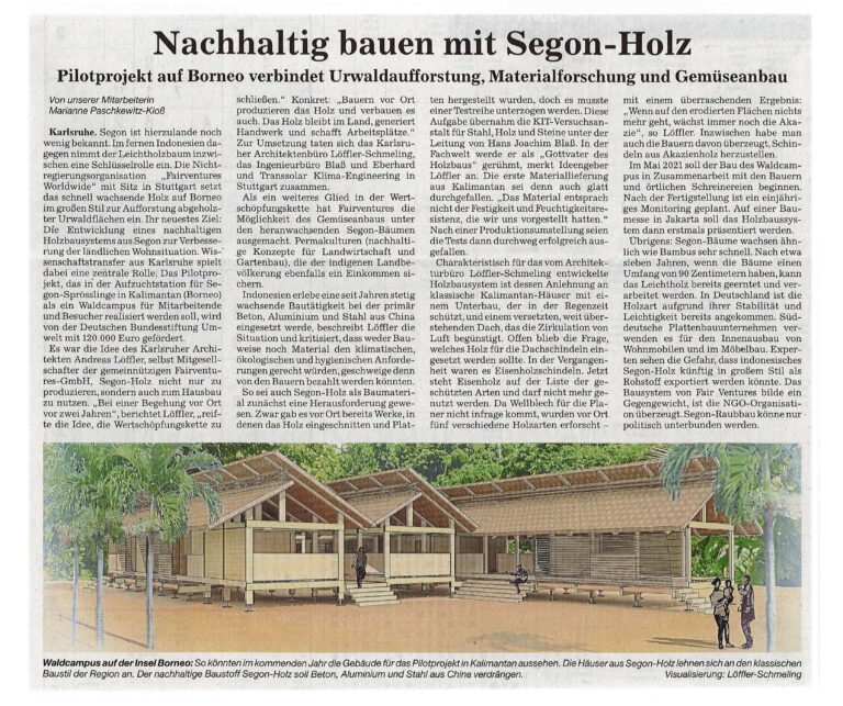 „Nachhaltig bauen mit Segon-Holz: Pilotprojekt auf Borneo verbindet Urwaldaufforstung, Materialforschung und Gemüseanbau“ so berichten die BNN über unser Forschungsprojekt in Borneo. „Bauern vor Ort produzieren das Holz und verbauen es auch. Das Holz bleibt im Land, generiert Handwerk und schafft Arbeitsplätze.“, wird Andreas Löffler im Artikel zittiert.