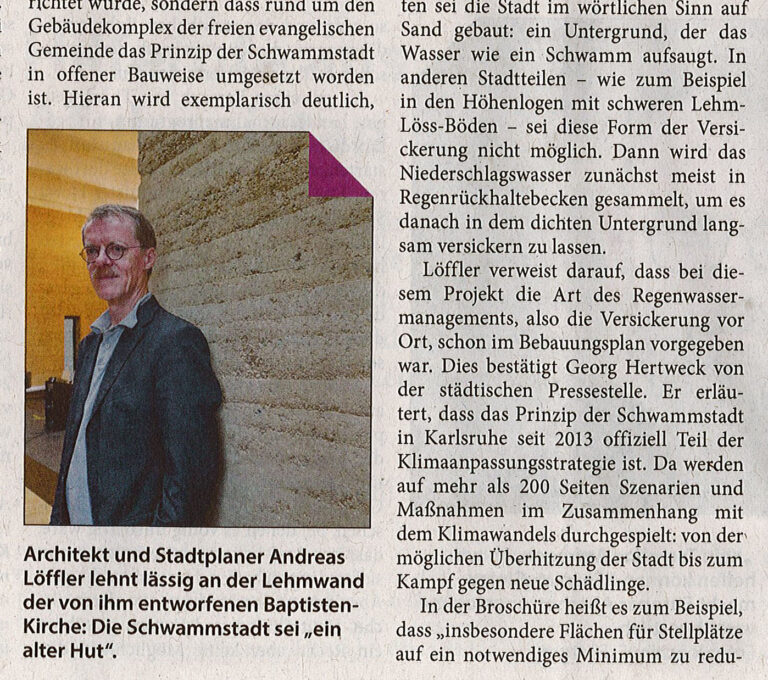In dem Artikel „Die Stadt als Schwamm“ vom 29.09.2021 wird der Umgang mit Regenwasser beleuchtet. Als Experte wurde Andreas Löffler hierzu interviewt – denn schon bei der Planung der Ökosiedlung Geroldsäcker 1993 war eine Regenwassernutzung wichtig. „Löffler erzählt stolz, wie auch schon Oberbürgermeister Frank Mentrup (SPD) die 1993 fertiggestellte