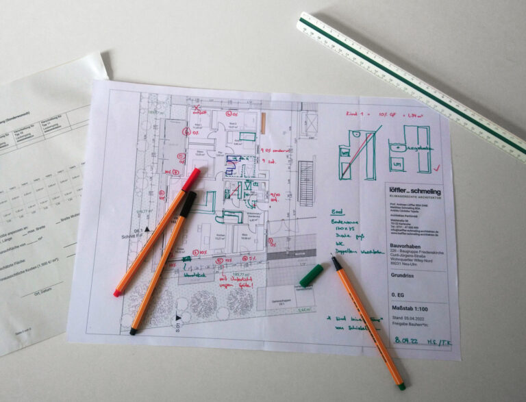 Die Grundrisse und die Fassade sind mit der Baugruppe und der Stadt (vor-) abgestimmt. Jetzt steigen wir in die Erstellung der Pläne und Formulare für den Bauantrag ein.