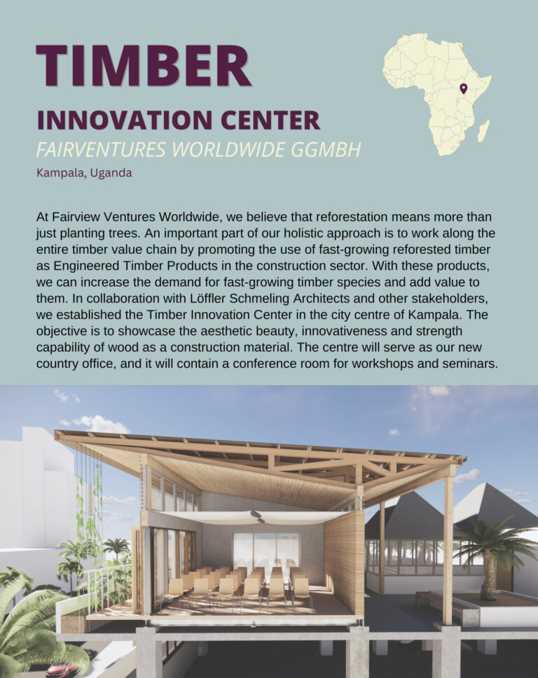 Faireventures Worldwide hat mit dem Fundraising für den Dachgeschossaufbau, das Timber Innovation Center, in Kampala, Uganda begonnen. Hierzu wurden bei uns Visualisierungen angefragt, die in einer Broschüre einen Eindruck des Holzbaus geben sollen. Auszug aus der Broschüre: In dem Neubau sollen „Workshops, Seminare, Schulungen und Veranstaltungen für verschiedene Akteure