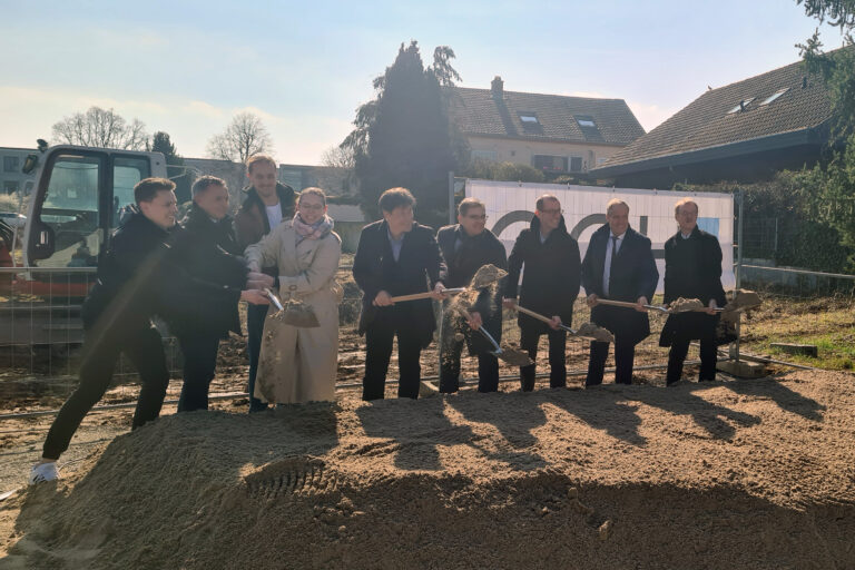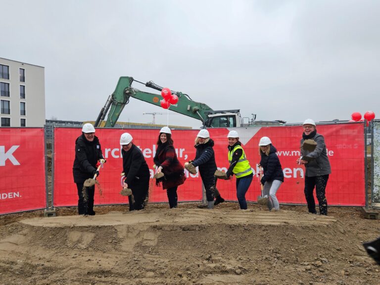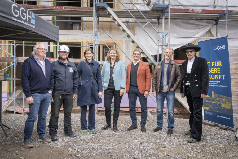 Am 8. März setzten wir zusammen mit der Gesellschaft für Grund- und Hausbesitz mbH Heidelberg (GGH), der Stadt Heidelberg und dem Universitätsklinikum Heidelberg (UKHD) den Spatenstich für das Neubauprojekt Mitarbeiter:innenwohnheim Wieblinger Weg. Hier entstehen in fünf Häusern 99 Kleinwohnungen für Beschäftigte des Universitätsklinikums Heidelberg. Das Neubauprojekt ist in modularer Holz-Hybrid-Bauweise
