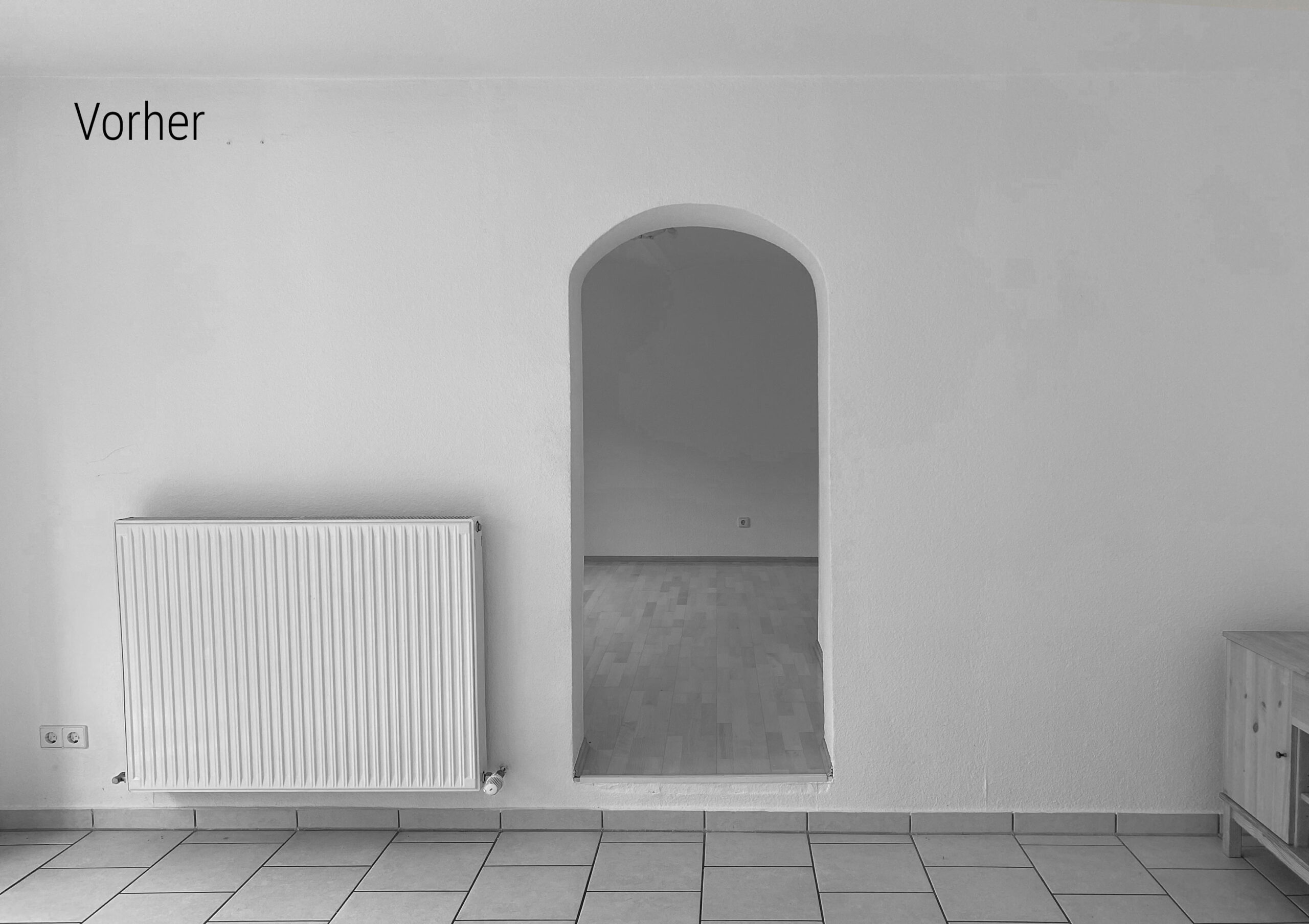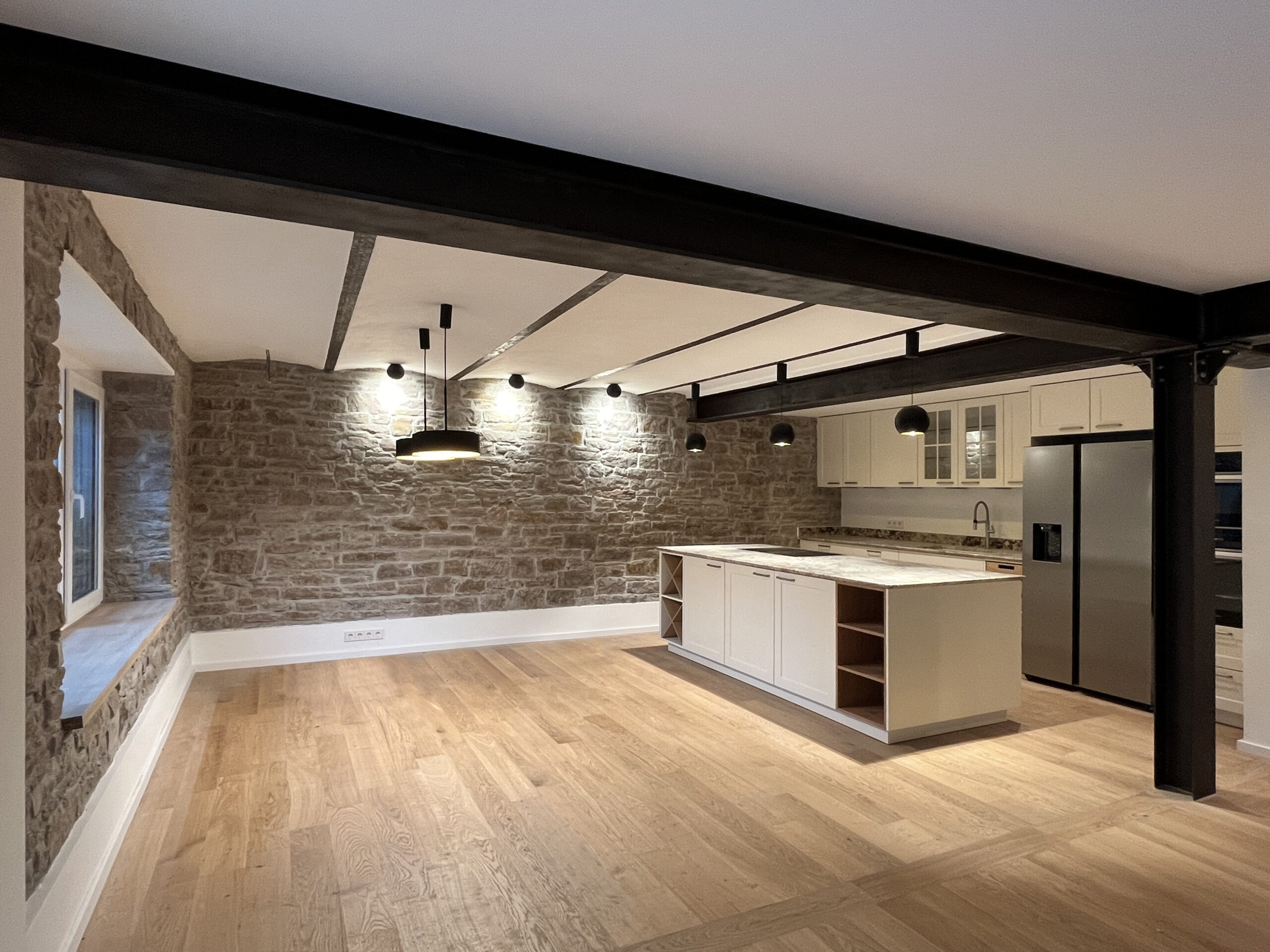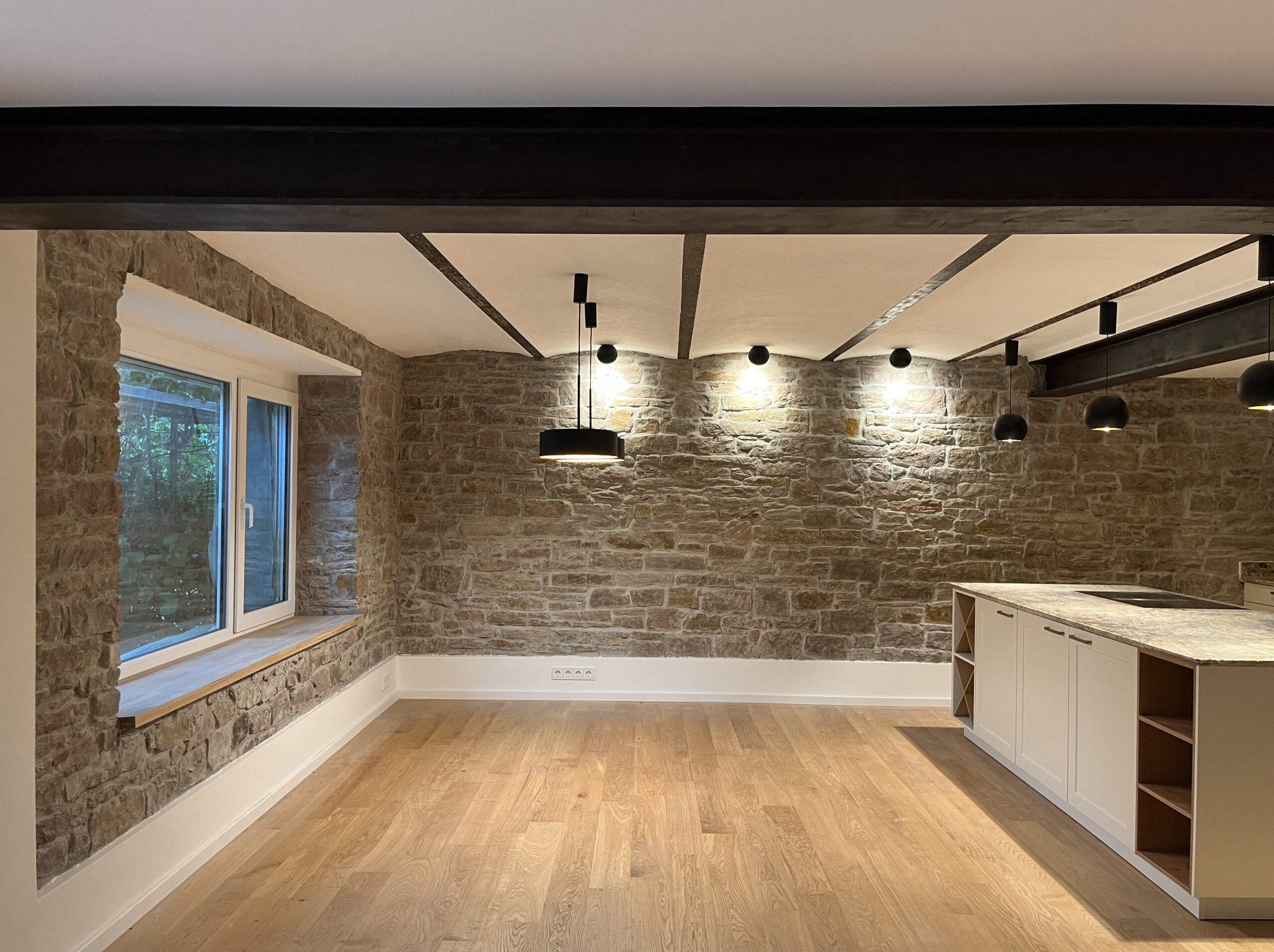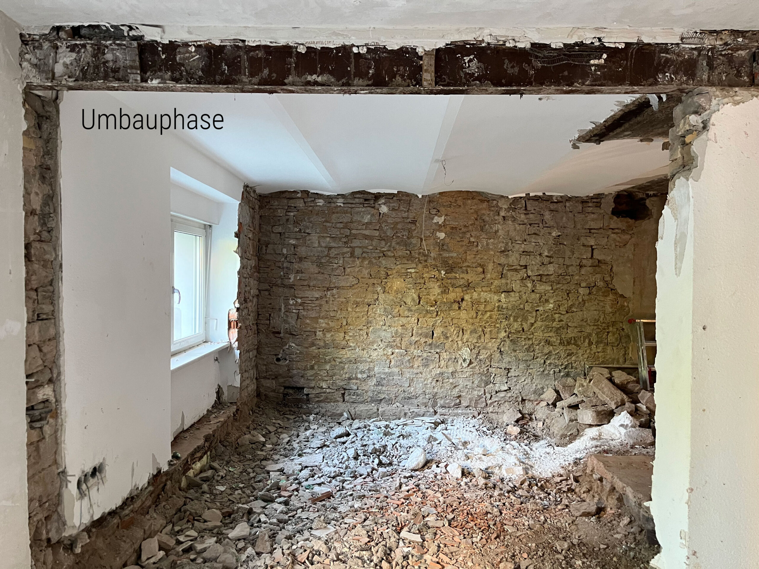 Originally, the old building probably served as a barn and both the room layout and the differences in floor level on the ground floor suggest that the building has already undergone several conversions. An older part is made of sandstone masonry, with wooden beam ceilings on the upper floor and capped ceilings on the lower floor. The later extension consists of reinforced concrete ceilings and solid, thick brick outer walls. The house was probably also given a new outer skin with 20 cm of insulation and plaster not too long ago, so the exterior appearance was good.