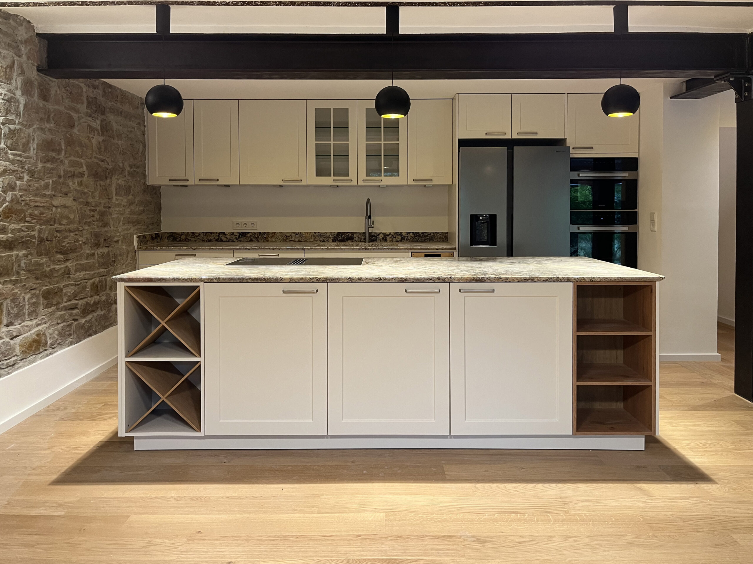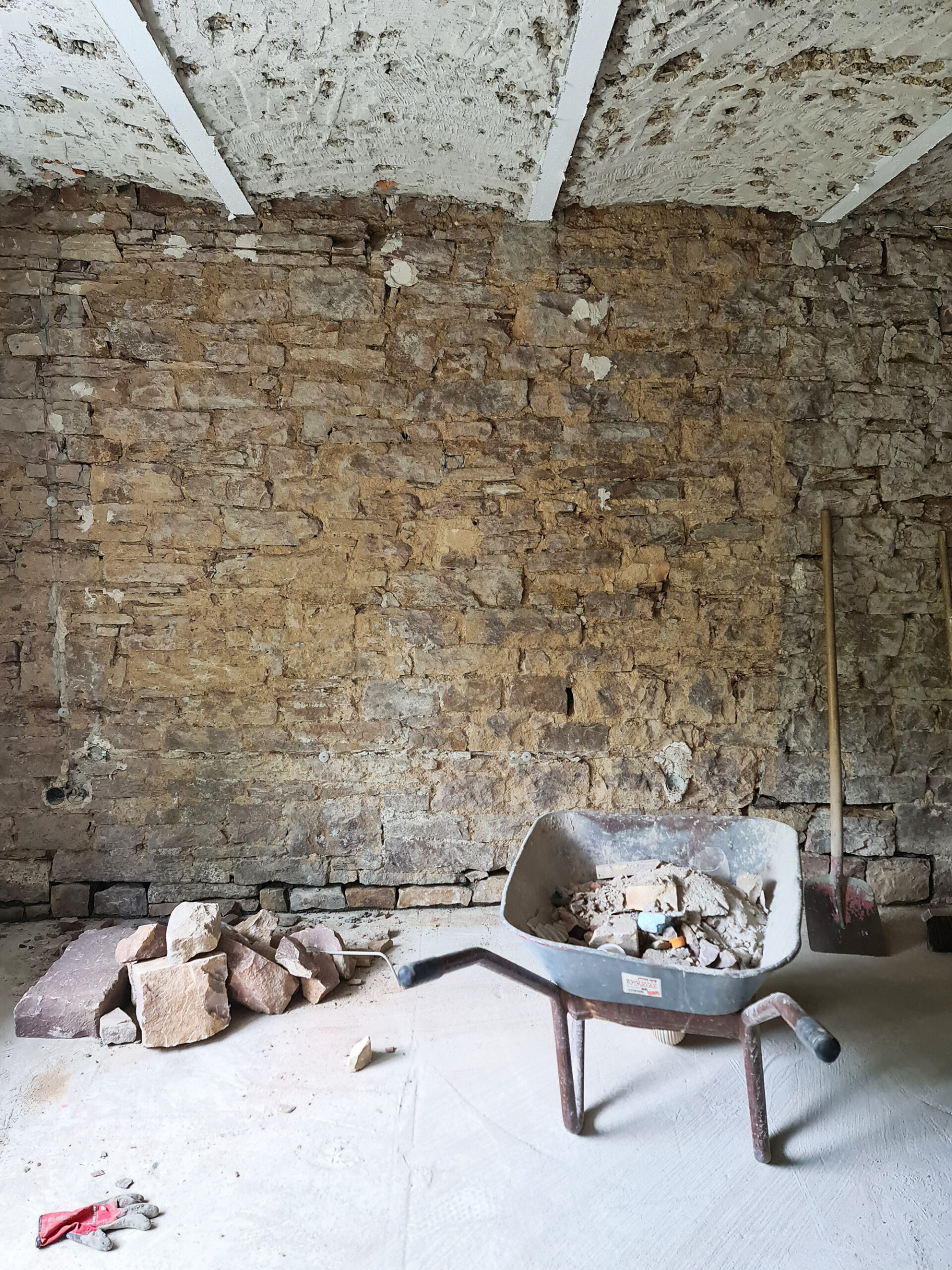 to honour and intelligently reuse existing material. Stones that were quarried elsewhere in the house are used to fill gaps in the exposed stone wall, which are then filled in.