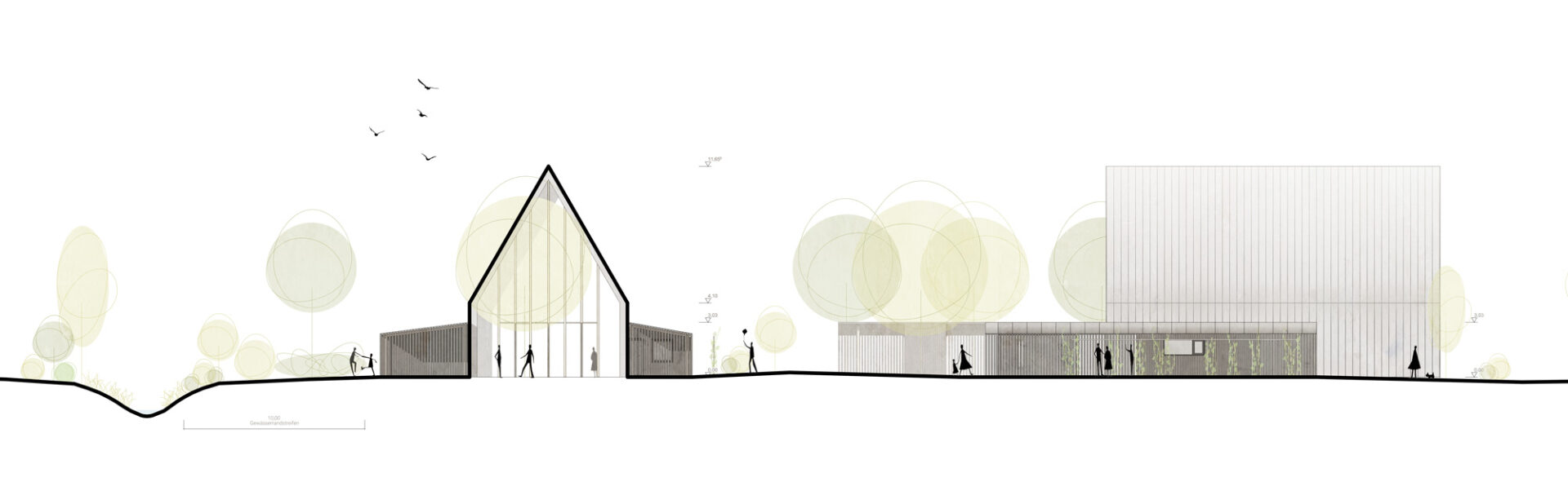 Im Bereich des Gewässerrandstreifens sorgt eine Baumreihe aus verschiedenen heimischen Bäumen (z.B. Tanne, Eiche, Buche etc.) für den Schutz zum Bach hin. Zudem sorgen diese für einen positiven Einfluss auf das Mikroklima und einen Schutz des Bodens bei eventuellen Überschwemmungen des Uferbereiches. Ergänzend werden Heckenpakete und Benjeshecken / Totholzhecken aus einheimischem Totholz eingeplant. Diese bieten einen Rückzugsort für viele einheimische Tiere wie z.B. Igel, zahlreiche Insekten usw. Das Dachflächenwasser wird in diesem Bereich versickert. Im südlichen Bereich soll ein Weidentippi oder Buchenholzhaus angepflanzt werden. Hier können Kinder spielen. Eine Natursteinsitzecke lädt gleichwohl Amphibien als auch Menschen zum Verweilen ein.