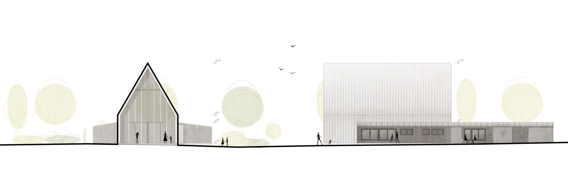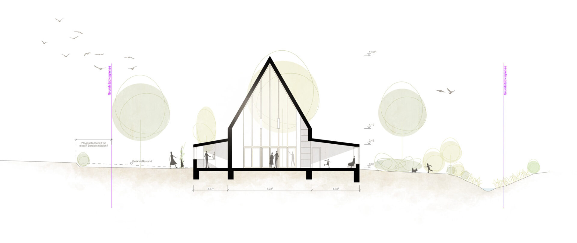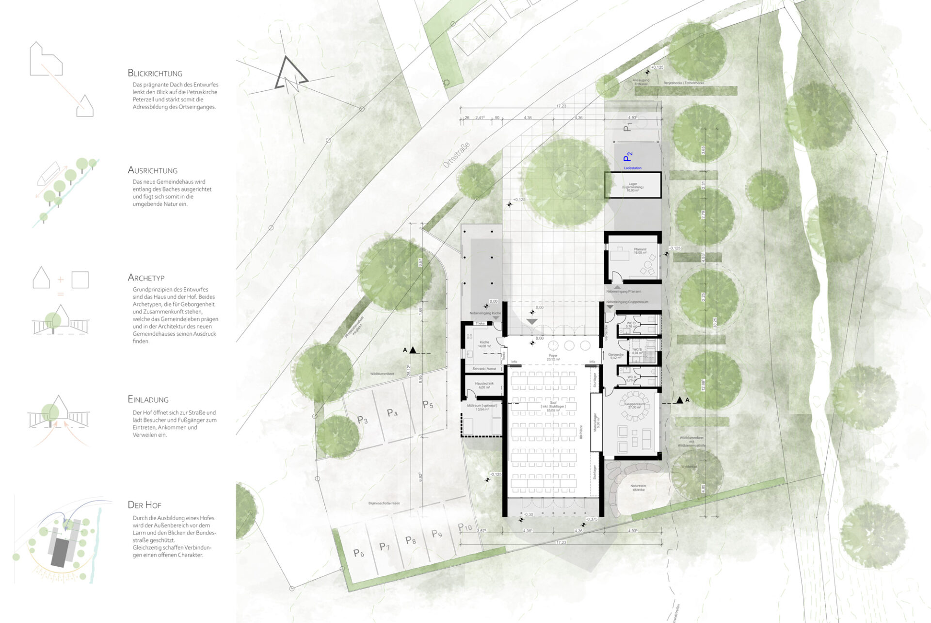 Der zweite Entwurfsgedanke ist der Hof. Ergänzend zum Gemeindesaal werden zwei Riegel links und rechts des Hauses ausgebildet, die die Richtung des Hauptdaches aufnehmen. Durch die Ausbildung der beiden Riegel entsteht ein Hof, der mehrere Funktionen übernimmt: Zum einen das Ankommen der Gemeindemitglieder, der Gäste bei Festen als auch der zufällig vorbeikommenden Besucher. Es wird eine Vorzone vor dem Eingang gebildet, die die Menschen einlädt, anzukommen und einzutreten. Zum anderen das Verteilen. Neben dem Haupteingang zum Foyer und Gemeindesaal ist auch der Liefereingang zur Küche vom Hof aus zu erreichen. Ein zusätzlicher Nebeneingang für den Gruppenraum ermöglicht es, den Saal und den Gruppenraum getrennt voneinander zu nutzen. Trotz der zentralen Lage des Pfarramtes für die leichte Auffindbarkeit, wird die notwendige Privatsphäre für seelsorgerliche Gespräche geschaffen, indem das Pfarramt leicht vom Gruppenraum + Sanitärbereich abgerückt ist, wodurch ein dem öffentlichen Bereich abgewandter Vorbereich erzeugt wird. Wird dies nicht gewünscht, kann das Pfarramt problemlos (ohne auf den separaten Eingang zum Gruppenraum verzichten zu müssen) an das Gebäude gerückt werden.