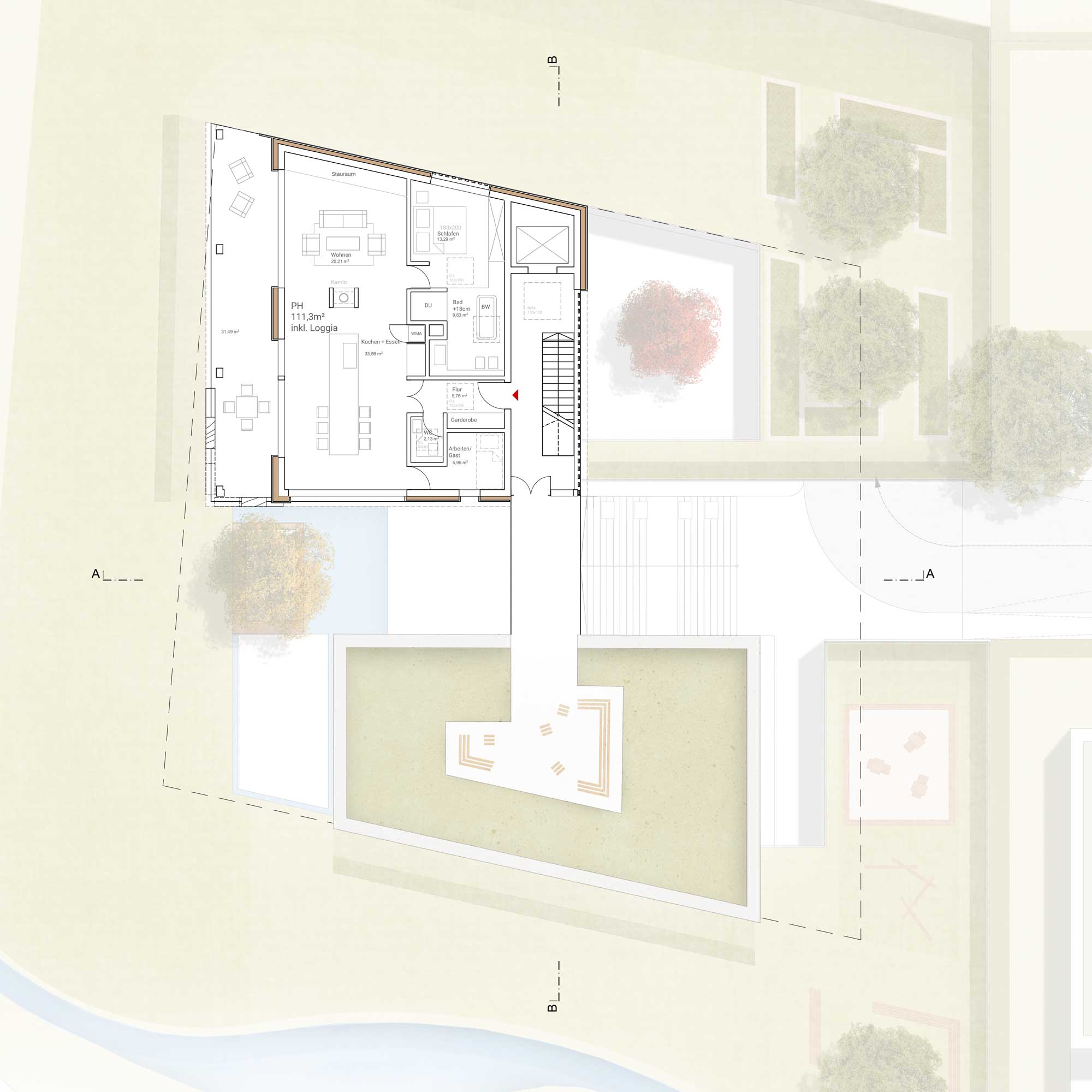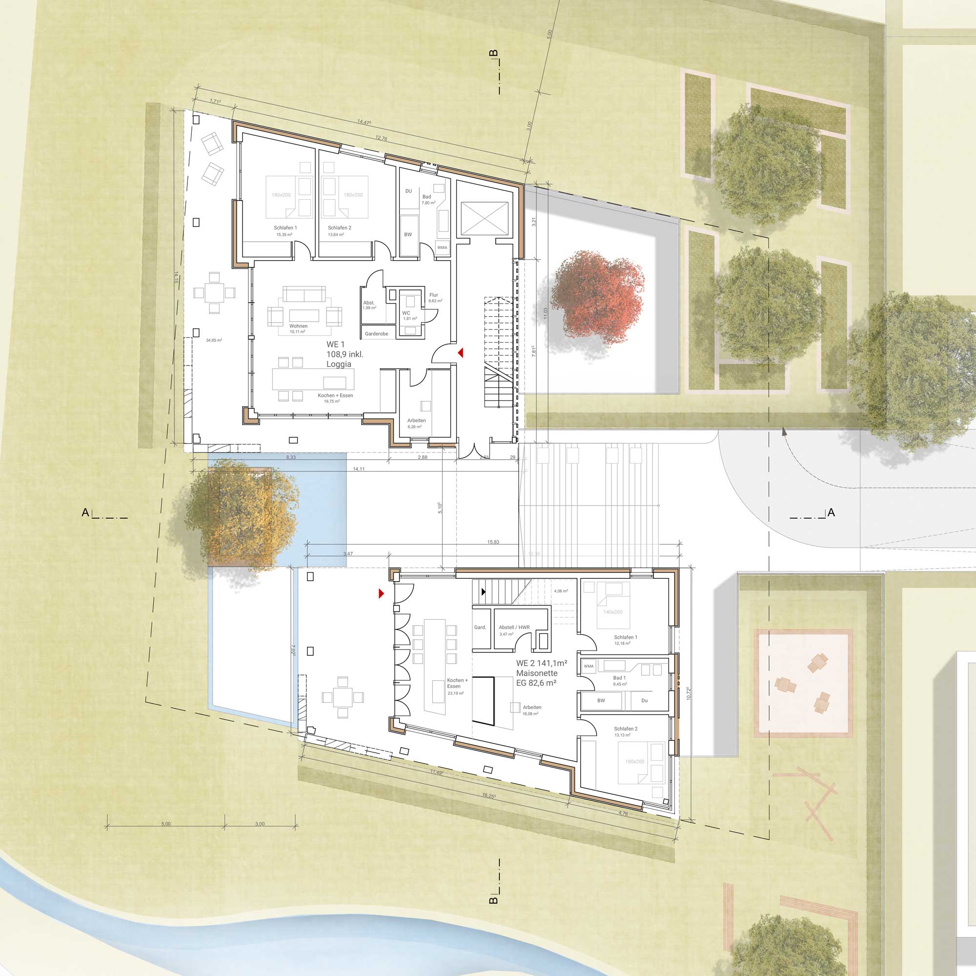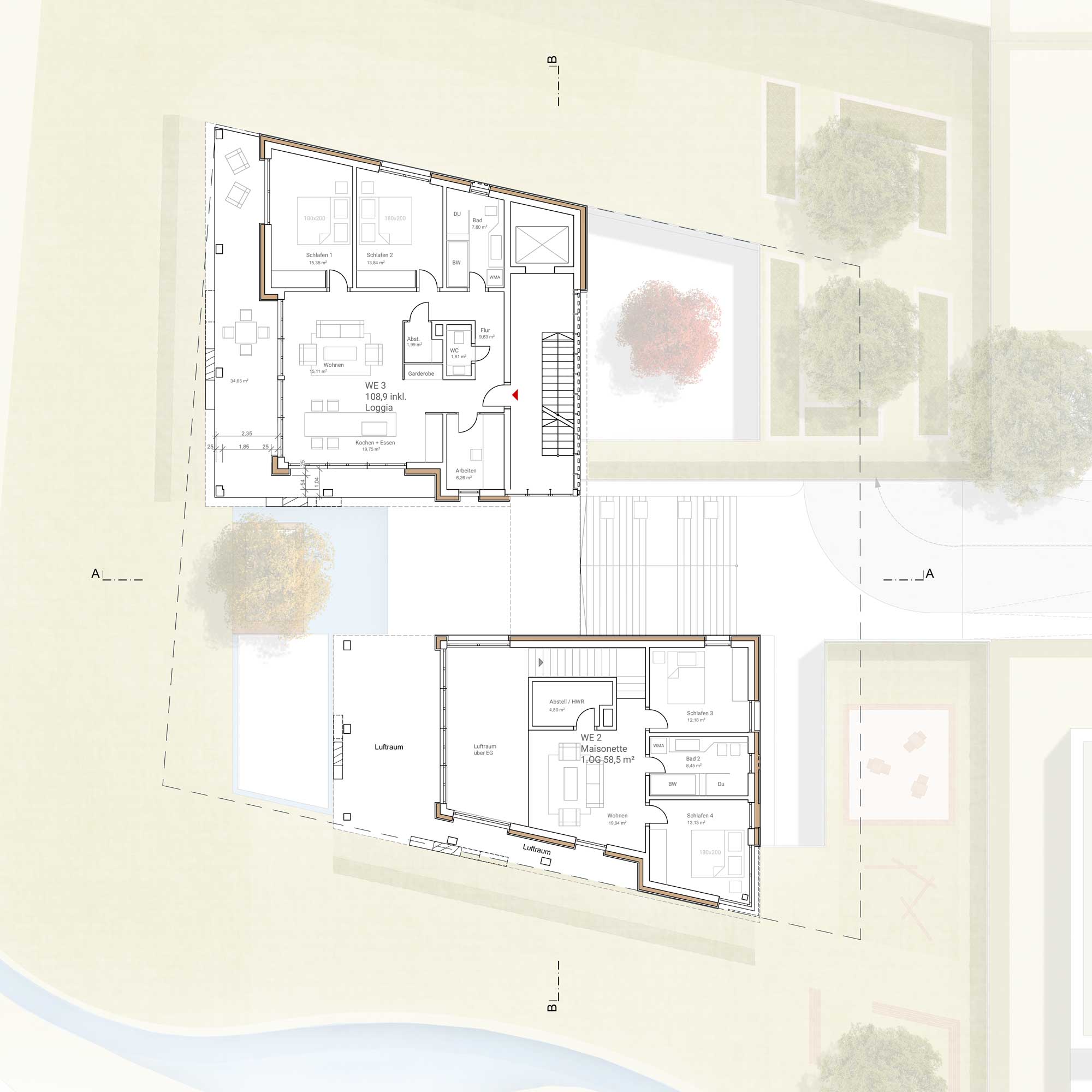 Im südlichen Baukörper kann im Sinne sozial nachhaltiger Architektur für selbstnutzende Bauherren anstatt einer Wohnung eine interne, gemeinschaftlich genutzte Fläche für Begegnung, Kultur, Kinderbetreuung und Weiteres realisiert werden.