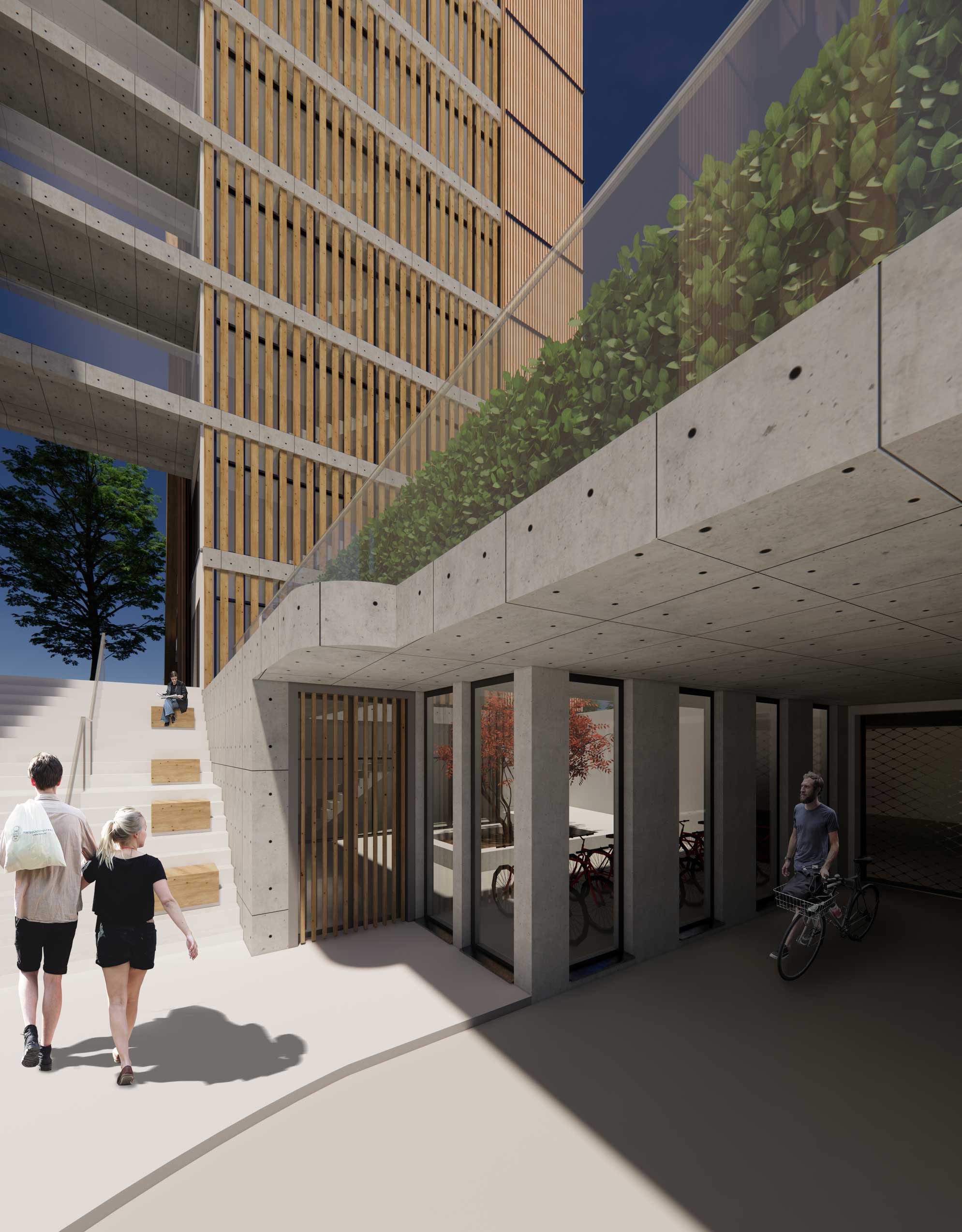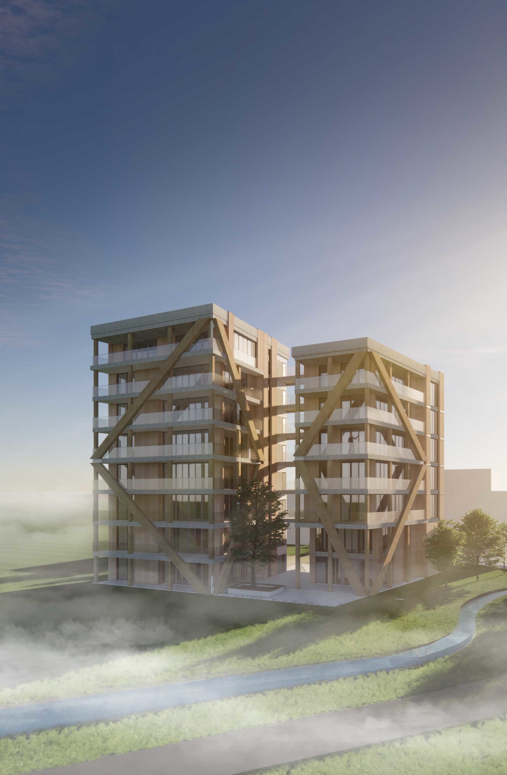 Durch die Trennung tragender und raumbildender Struktur entsteht ein Gebäude, welches variabel und individuell anpassbar ist. Auch die Bauweise zeigt sich hybrid durch den gezielten Einsatz von Holz und Beton. Dabei offenbart die Fassade einen bewusst konstruktiven Holzbaucharakter mit Diagonalen, die über alle Geschosse spannen.