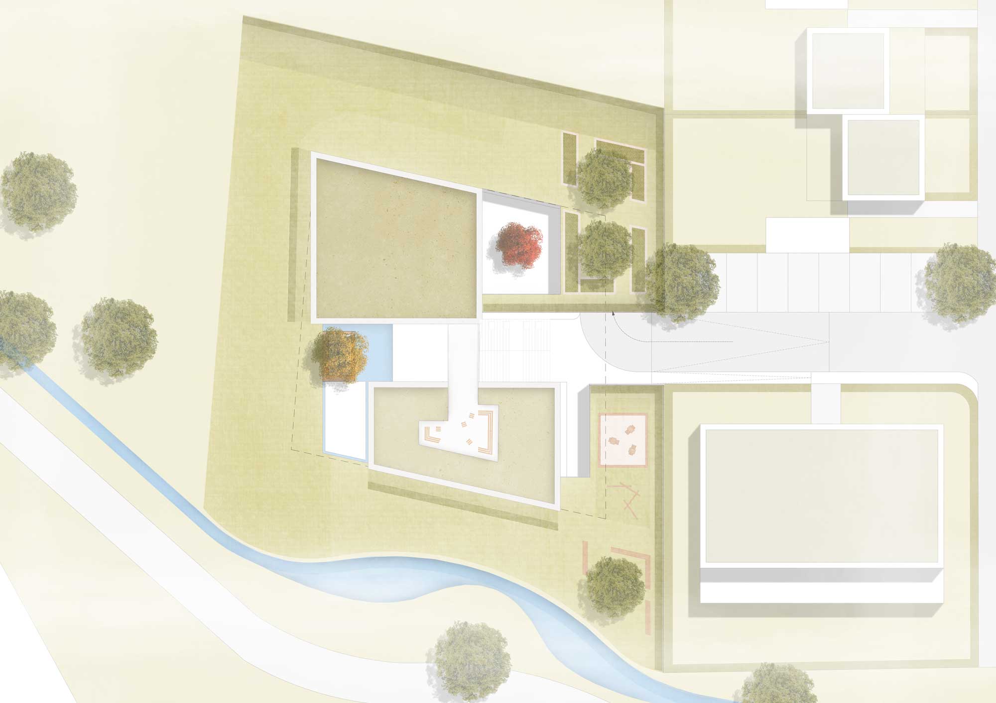Die abfallende Rampe zur Erschließung des Untergeschosses mit einem einladenden Eingangspatio wird von einer Treppenanlage weitergeführt, die wie selbstverständlich auf dem Erdgeschossniveau mündet. In Verbindung mit einem Wasserbecken und Sitzgelegenheiten unter einem Baum entsteht so ein qualitätsvoller Aufenthaltsbereich. Das Wasserbecken leistet neben der gestalterischen Funktion als zweilagiger Energieteich einen Beitrag zum Energiekonzept des Gebäudes. Das zentrale Fluchttreppenhaus mit Aufzug dient der Erschließung beider Türme, die über Stege verbunden sind. Die eher geschlossenen Nord-Ost Seiten stehen den aufgelösten Süd-West Seiten mit großen Freibereichen und einer Emphase Richtung Frankfurt gegenüber.