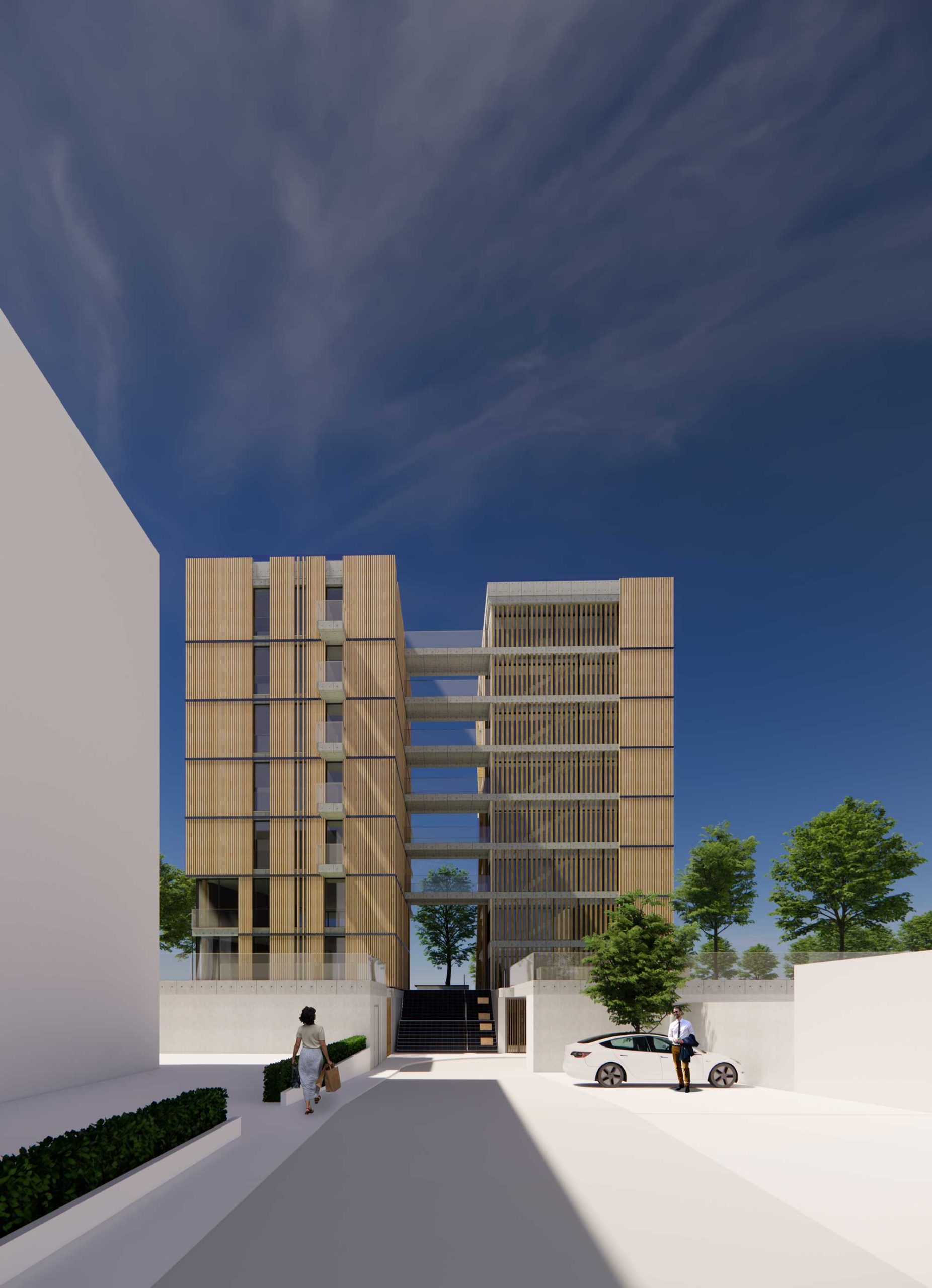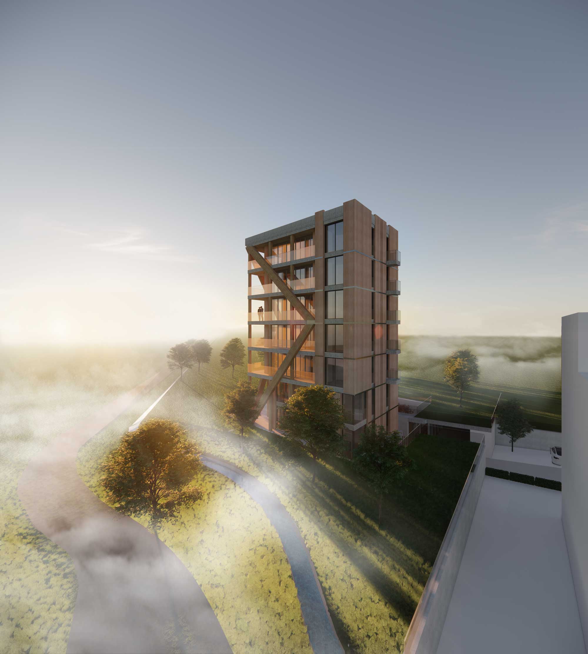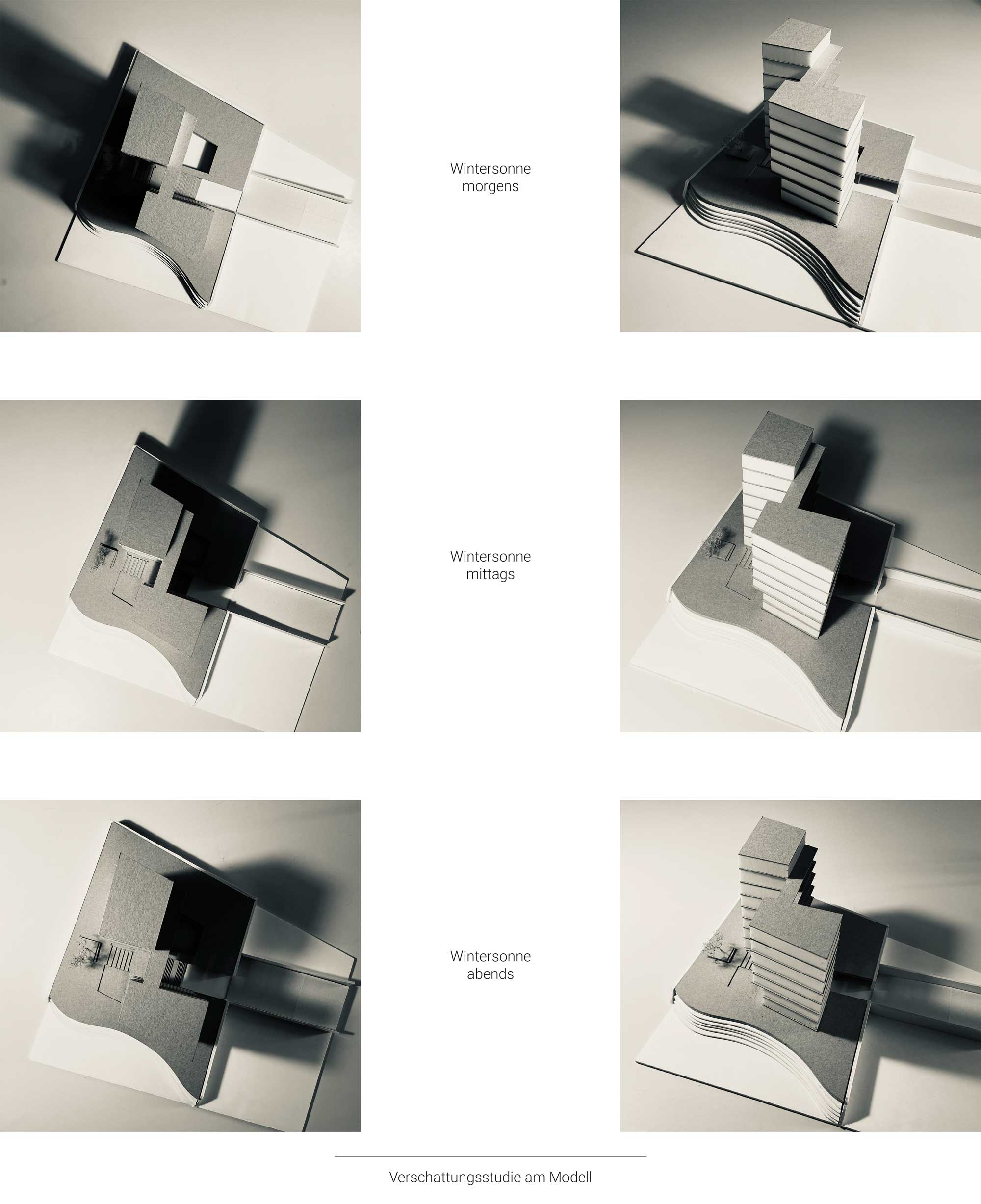 Das Gutachterverfahren „Holzturm“ in der ÖkoSiedlung Friedrichsdorf bei Frankfurt wurde im Büro enthusiastisch bearbeitet. Zunächst wurden im bürointernen Wettbewerb Varianten entwickelt, im Anschluss deren Vor- und Nachteile studiert und abgewogen. Dabei konnte sich eine aufgelöste Variante durchsetzen: Ein Haus bestehend aus zwei schlanken Türmen, die in einem Dialog zueinander und zur Umgebung stehen und eine prägnante Adresse bilden. Gleichzeitig wird die städtebauliche Körnung der Umgebung aufgenommen. Die versetzten Baukörper der Türme nehmen sich der Sprache des Quartiers an und bilden durch ihren Höhepunkt einen Abschluss. Zentrales Thema ist eine intuitive, helle und freundliche Erschließungsachse, die vom Untergeschoss auf das erhöhte Grundstück führt.