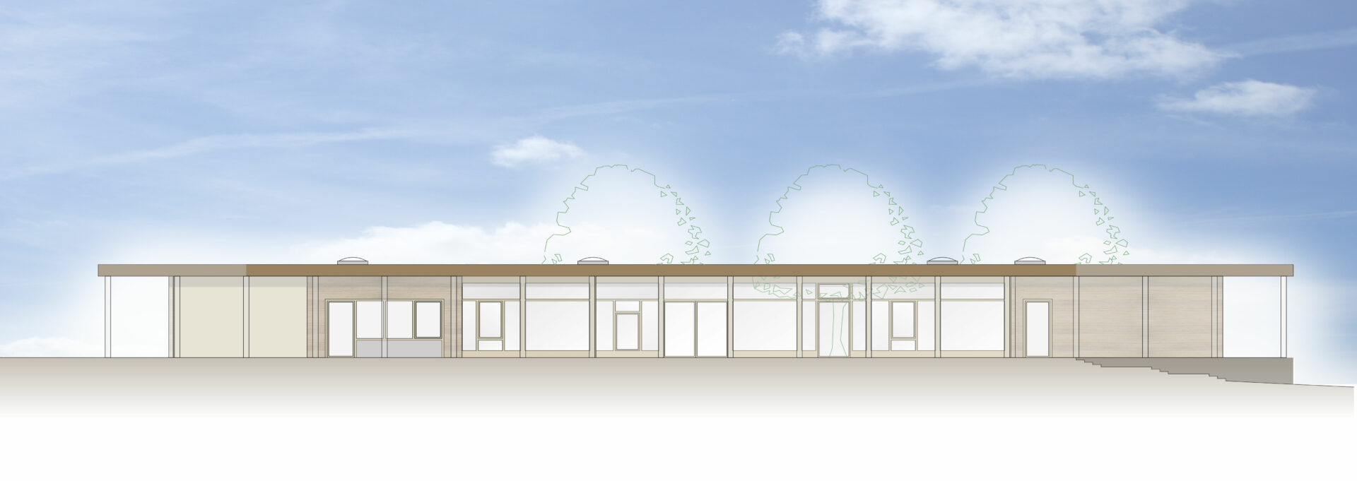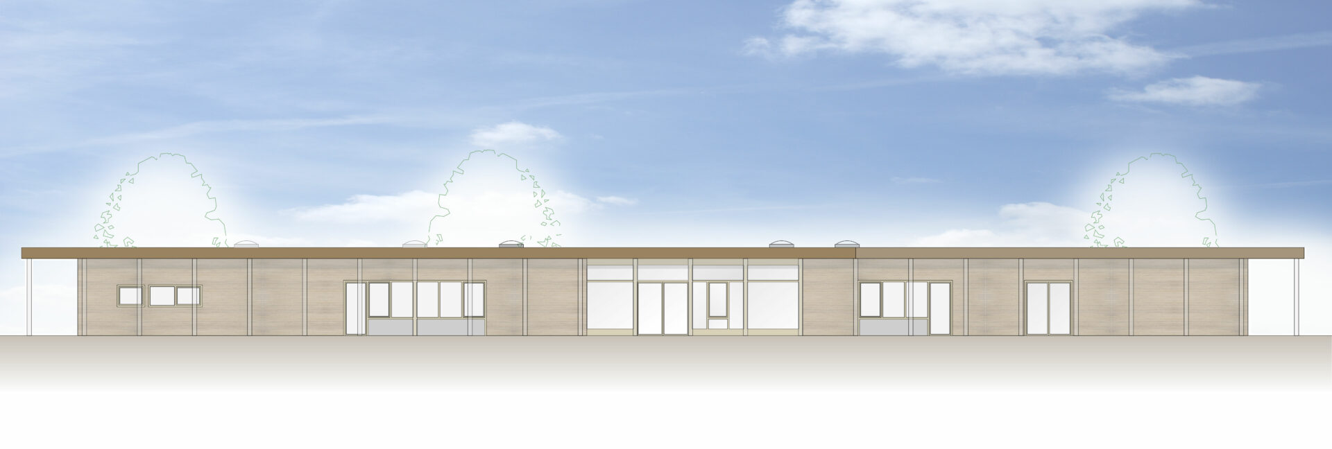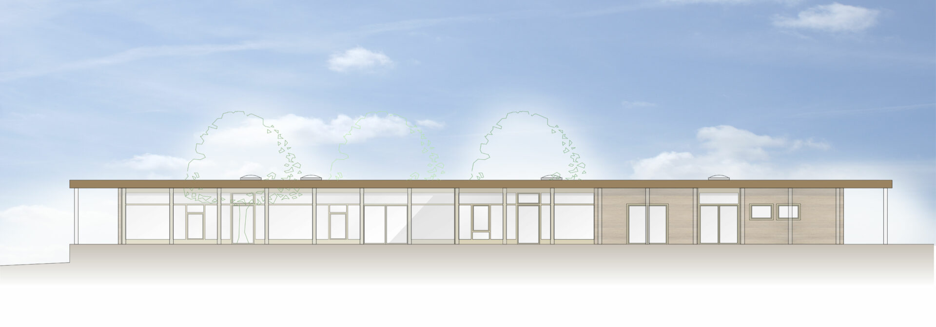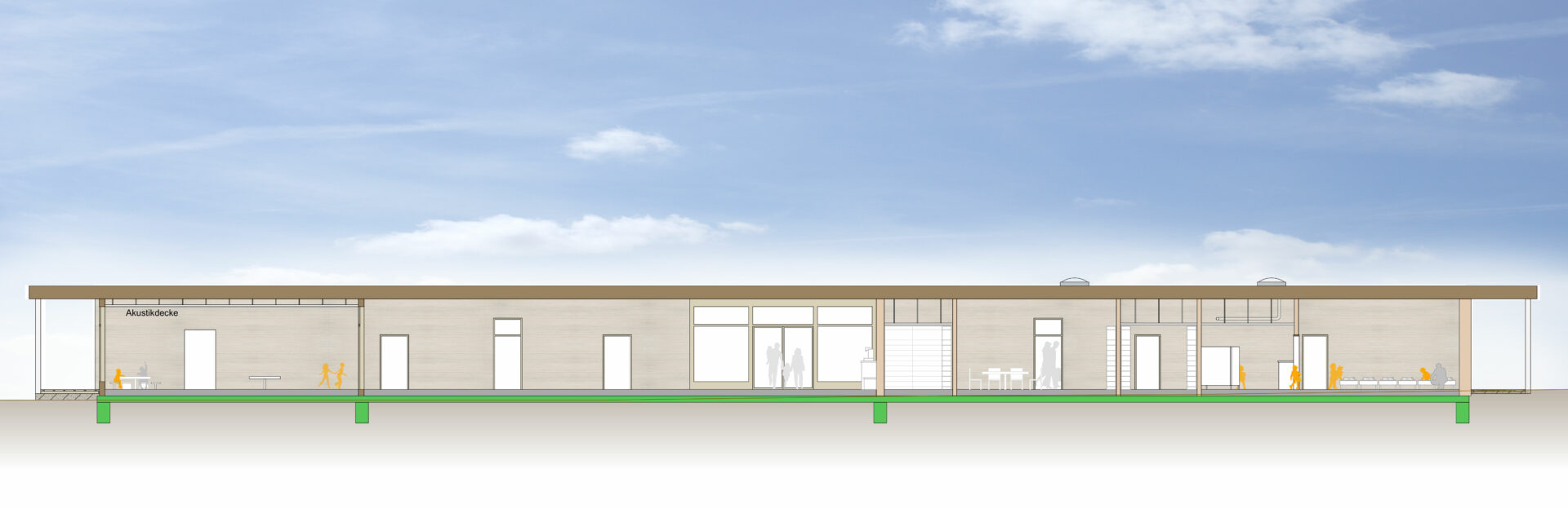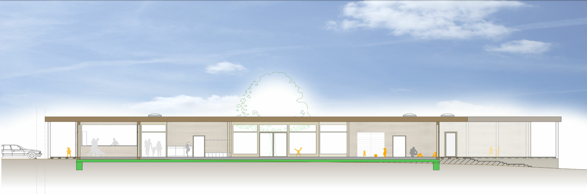 Die gestalterische Grundidee des Gebäudes entwickelt sich aus der Vorstellung, man habe über vier ausgebreitete Spieldecken eine transparente, schützende Hülle gestülpt. Innenraum und Außenraum verschmelzen, sodass der Bezug zur Landschaft und zur Natur überall gegeben ist. Das Gebäude ist in seiner Ästhetik reduziert. Die Oberflächen ergeben sich primär aus den verwendeten Materialien. Deren Optik, Haptik und Geruch sind gerade für Kinder wichtige Sinneserfahrungen. Im Inneren des Gebäudes gibt es für die vier Gruppen jeweils eigene, überschaubare Raumbereiche, die um eine belebte Mitte angeordnet wurden. Es wurde darauf geachtet, dass die Struktur eine sowohl horizontale als auch vertikale Erweiterung zulässt.