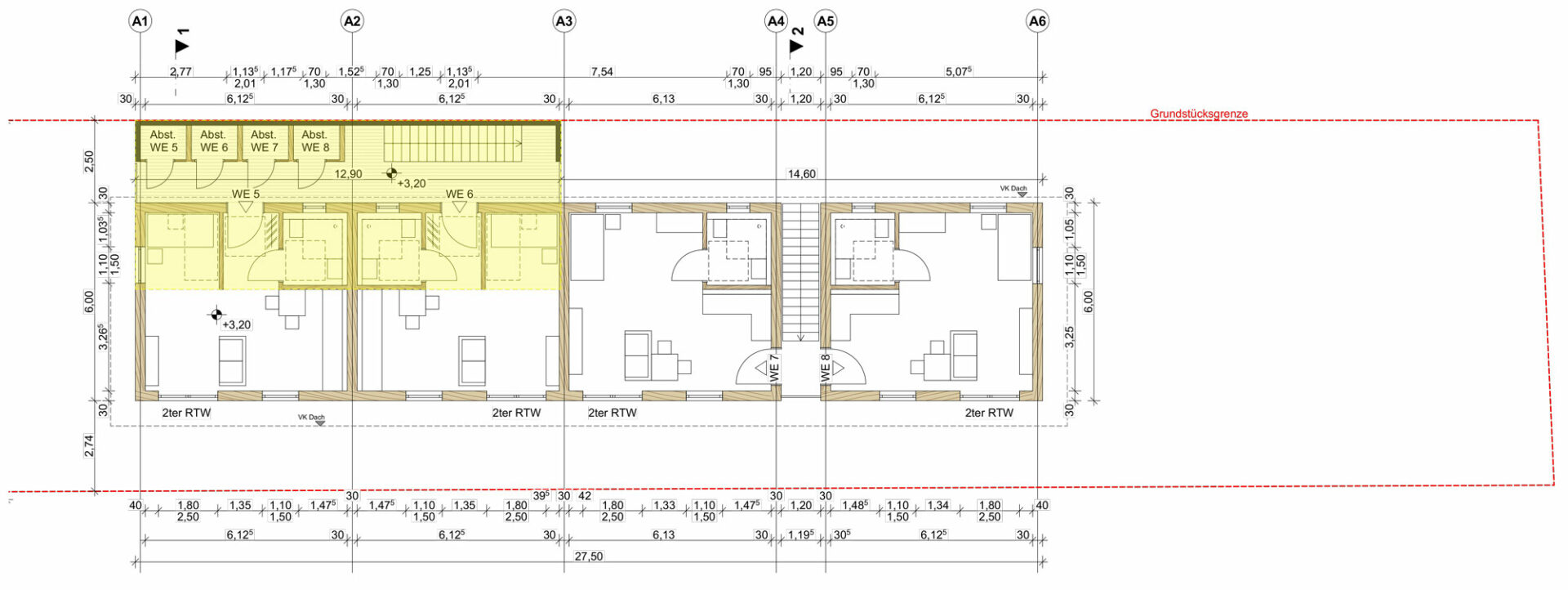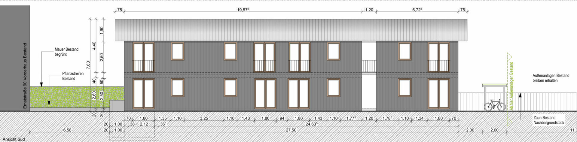 Im Hof entsteht auf einer Fläche, die bisher ein alter Schuppen für Gartengeräte eingenommen hat, ein KfW 55 Holzmassivbau mit acht Appartements zu je 32qm Wohnfläche.