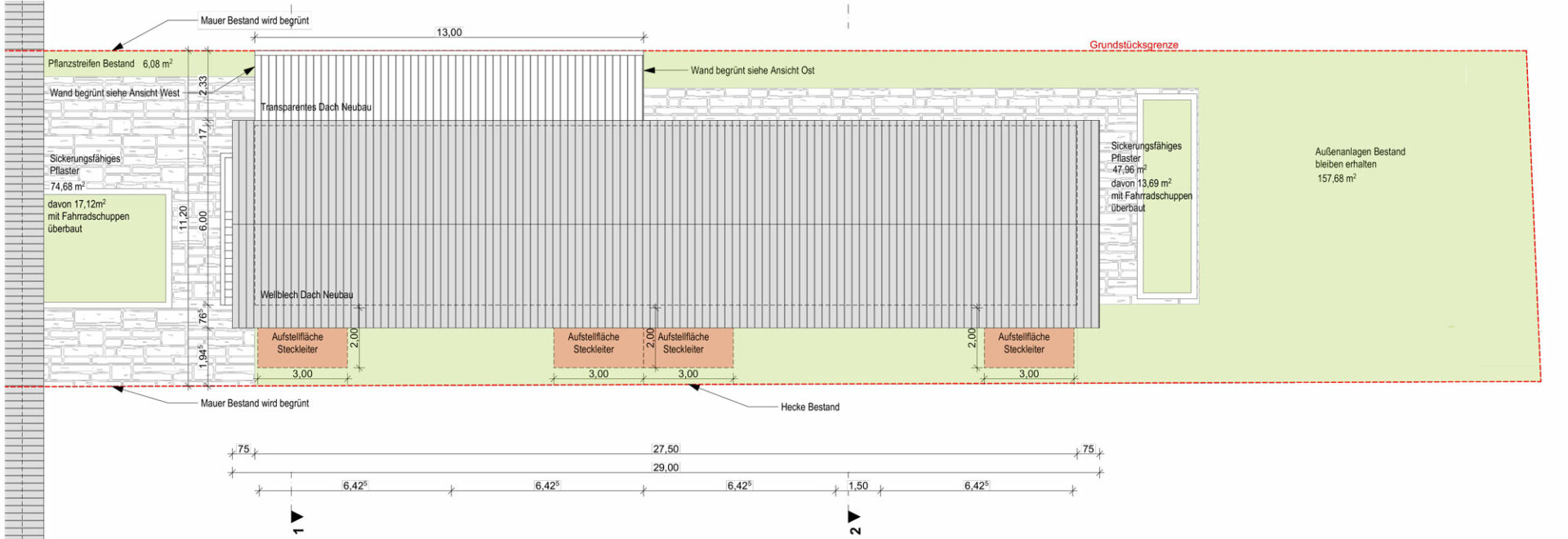 Wo es möglich ist, werden die bestehenden Außenanlagen erhalten, so kann direkt nach Bezug des Neubaus schon raus in eine gewachsene grüne Umgebung geschaut werden.